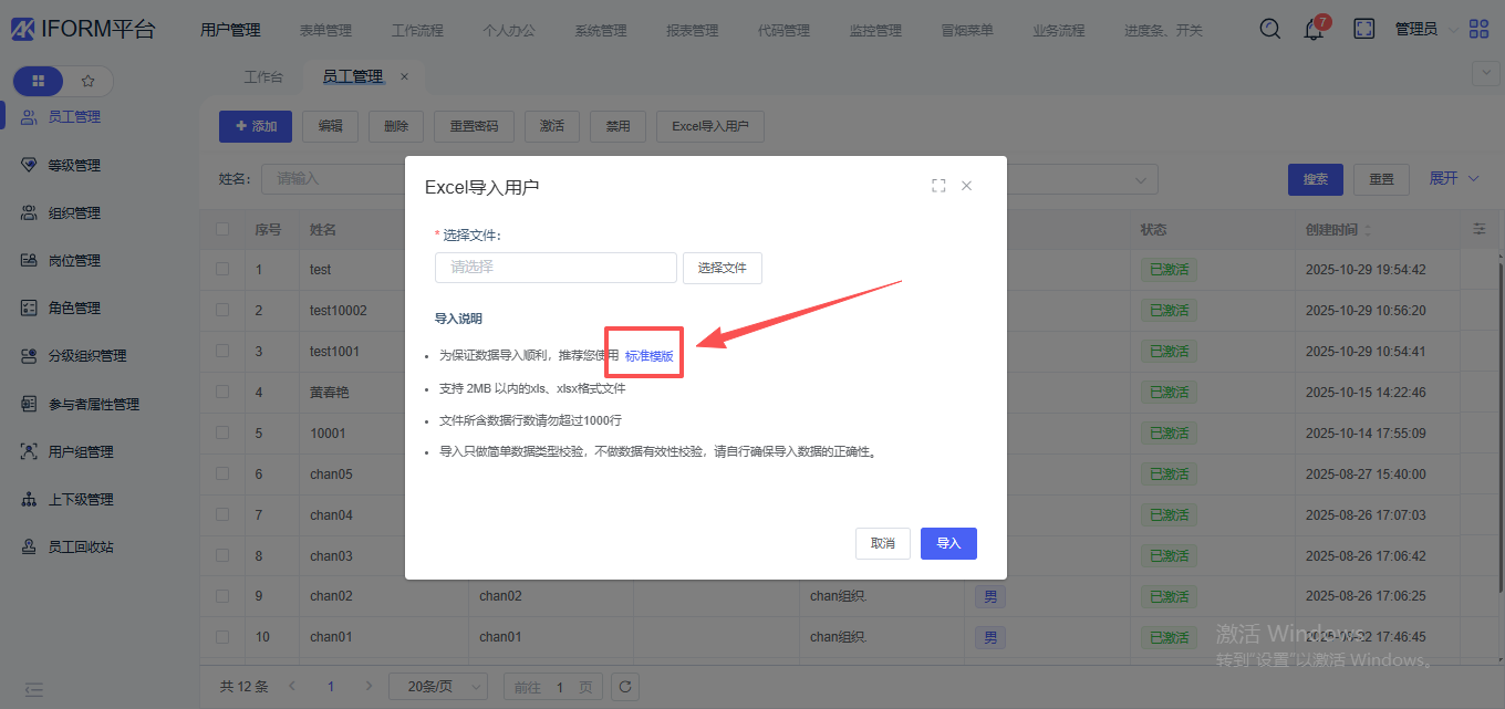 1、点击下载“标准模板”:excel内容有表头,即姓名、账号、密码(若没传值默认为“1”)、微信企业号、邮箱、手机号、性别、钉钉号、所属组织(创建时间和状态不需要出现默认当前导入时间和“激活”);