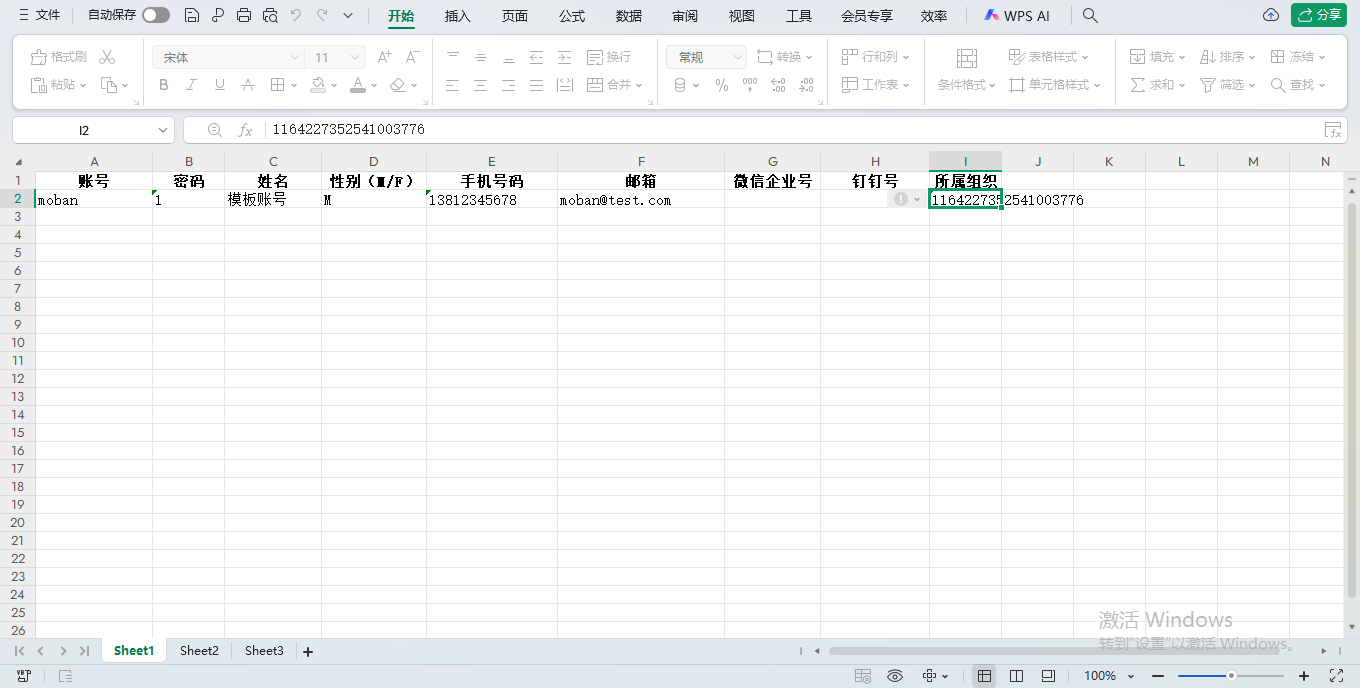 2、根据下载的excel模板内容进行批量增加用户信息,注意校验规则:账号,密码,邮箱,手机号、所属组织必填;