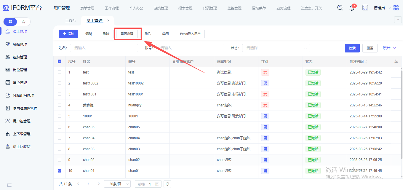 【员工管理】界面,选择我们所需重置密码的用户信息,点击“重置密码”功能按钮。