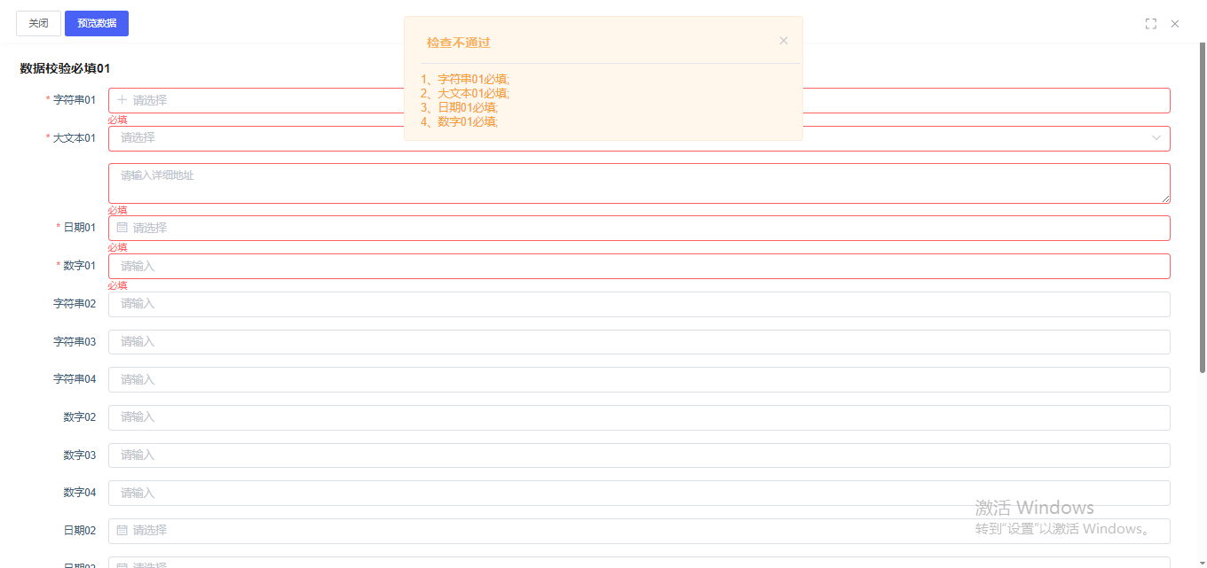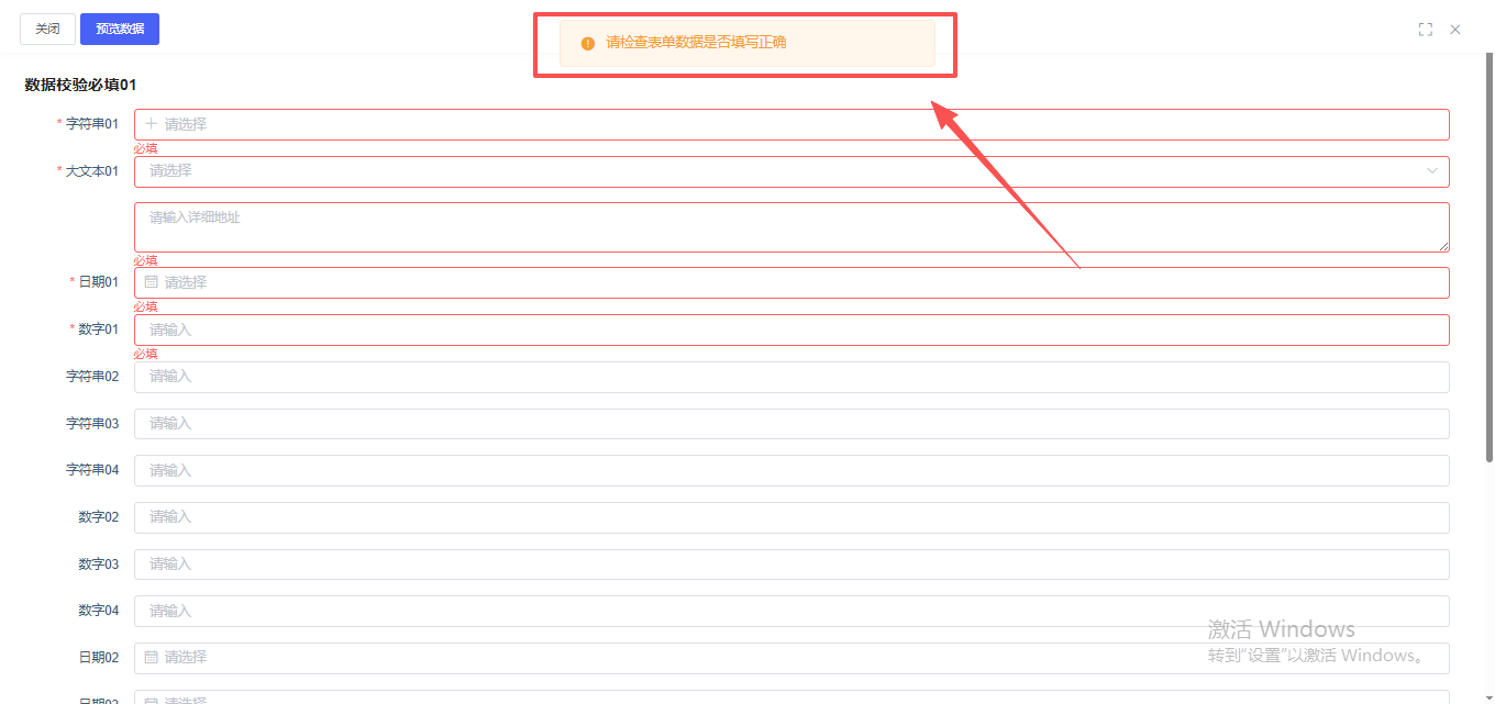 • 不开启【汇总校验提示消息】时,表单进行校验时,只显示[请检查表单数据是否填写正确]