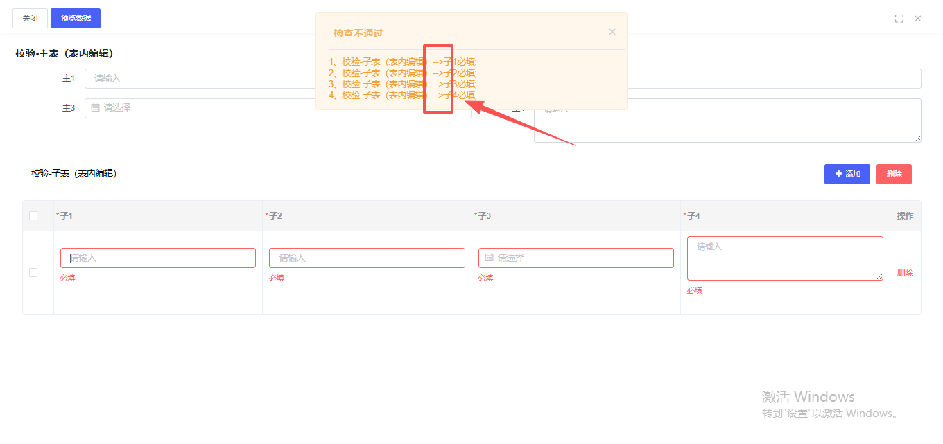 (1)开启【是否聚焦第一个错误】时,进行数据校验时,会自动定位到第一个错误的位置