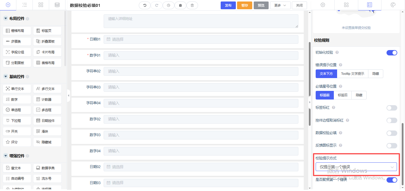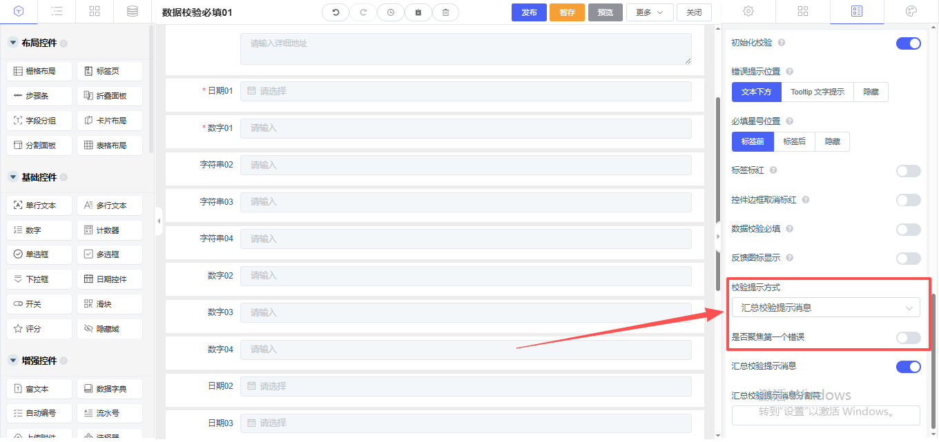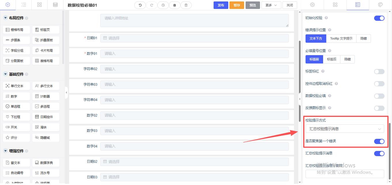 • 当【校验提示方式】设置【汇总校验提示消息】、【仅提示第一个错误】时,可设置【是否聚焦第一个错误】