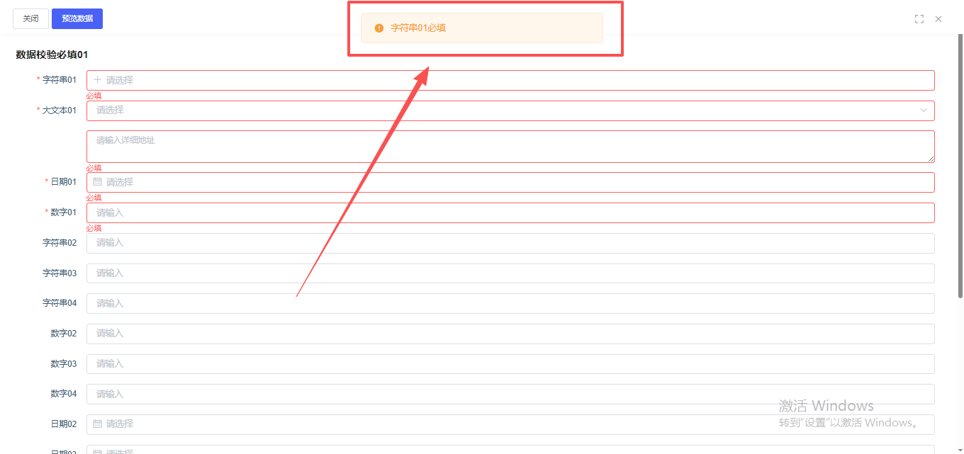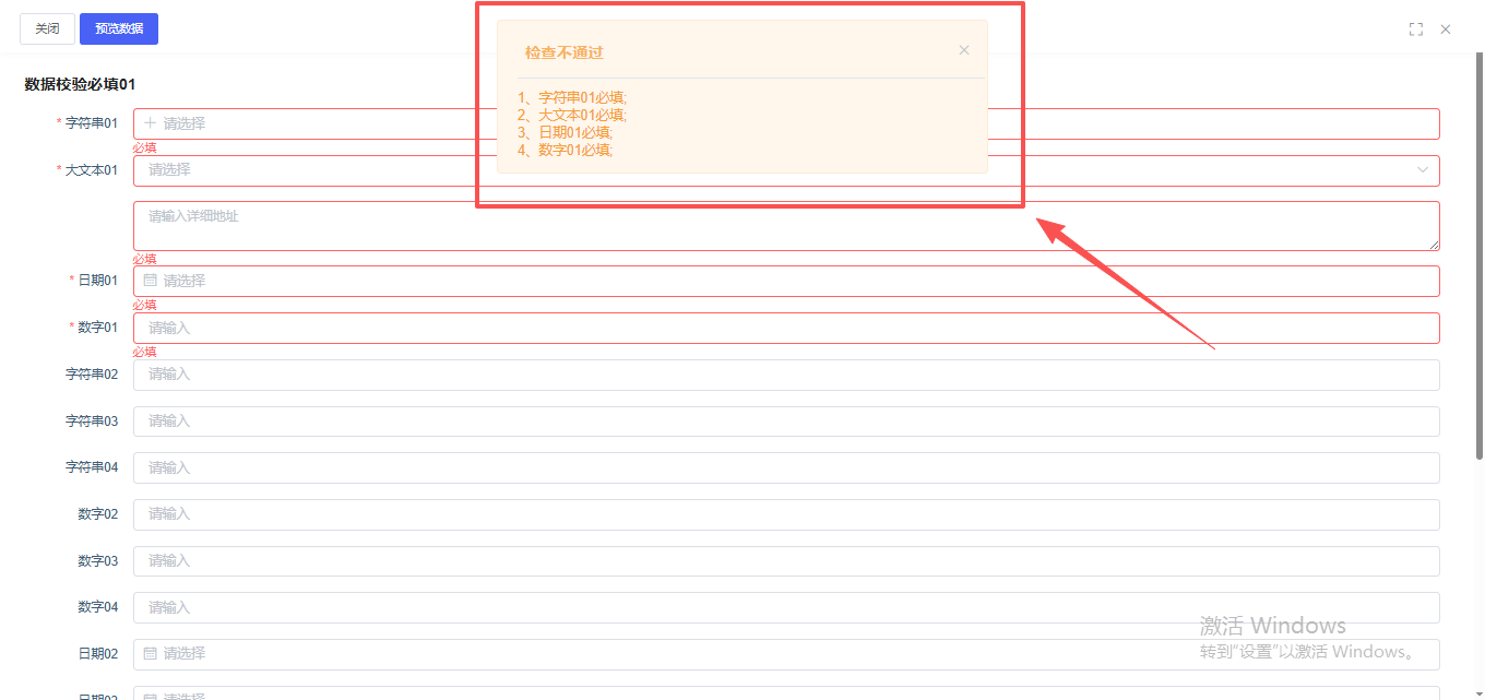 • 开启【汇总校验提示消息】时,表单进行校验时,将全部报错的数据汇总到一个报错提示框内显示全部消息